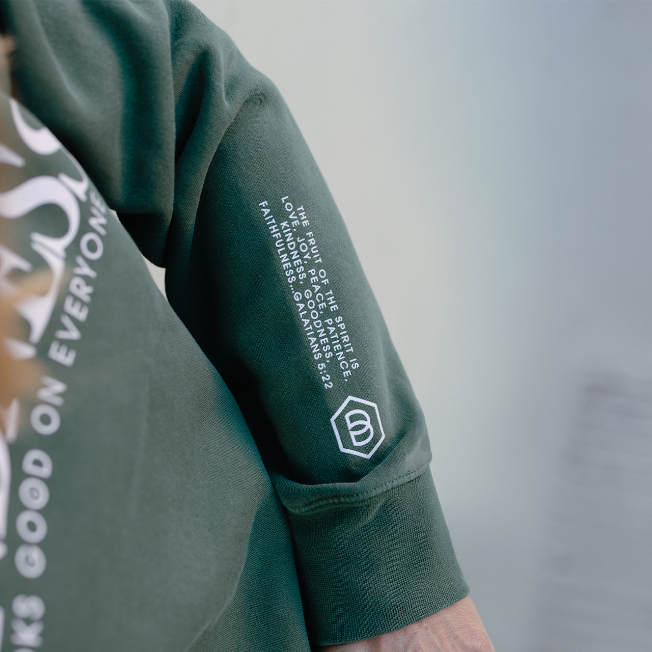 A simple message with a big impact — the Kindness Looks Good Crewneck is a cozy reminder that compassion never goes out of style. With its soft forest-green color and blush pink lettering, this sweatshirt pairs effortlessly with jeans, leggings, or your favorite lounge pants. The left sleeve features a little reminder from Galatians 5:22, "The fruit of the spirit is love, joy, peace, patience, kindness, goodness, faithfulness..."